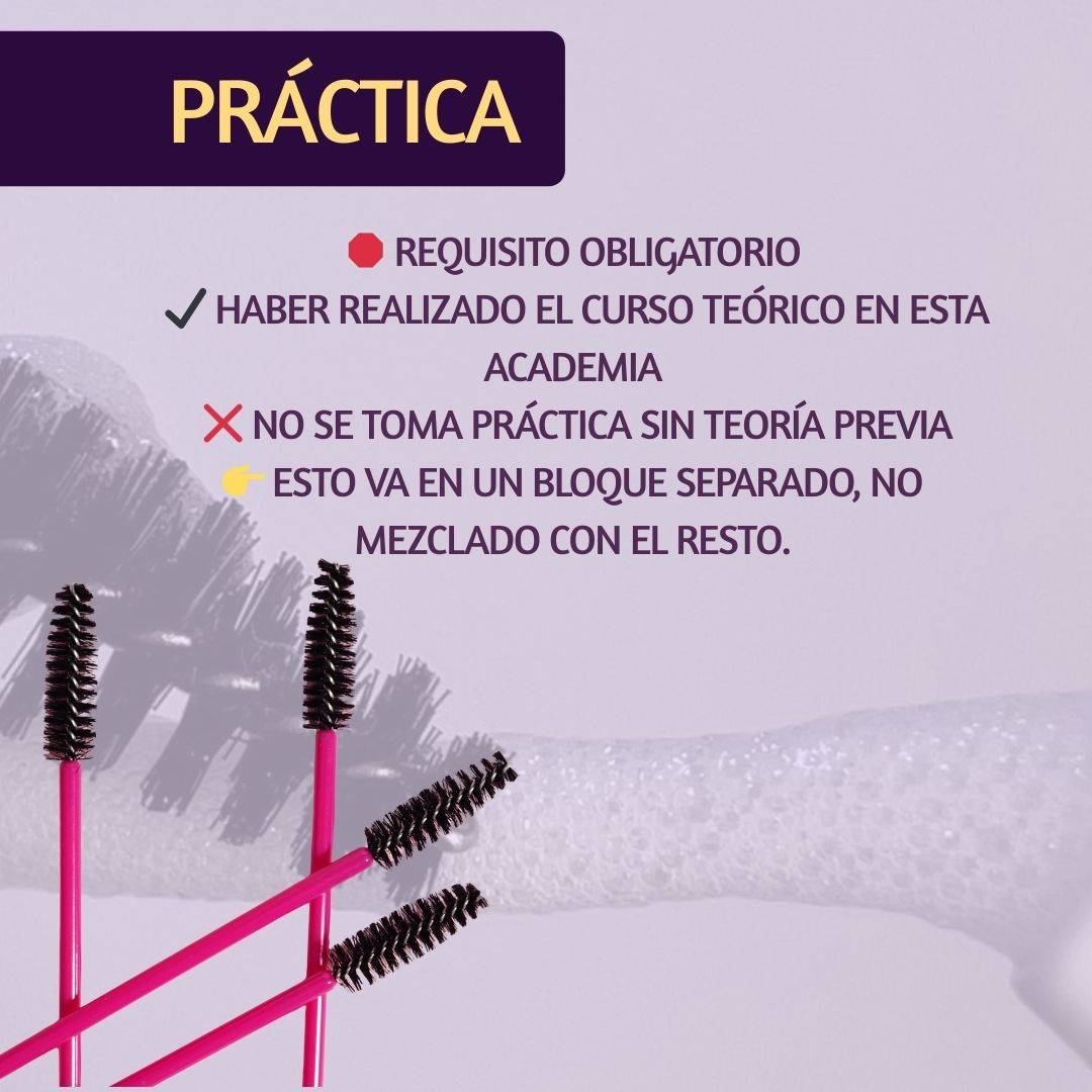 La práctica presencial dura aproximadamente 4 horas en servicios de extensiones y 2hs con lifitng o cejas. Es intensa, completa y súper productiva.